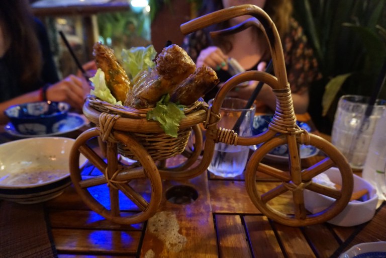 Dinner was absolutely divine. We ordered a starter of spring rolls – which arrived in a bicycle!