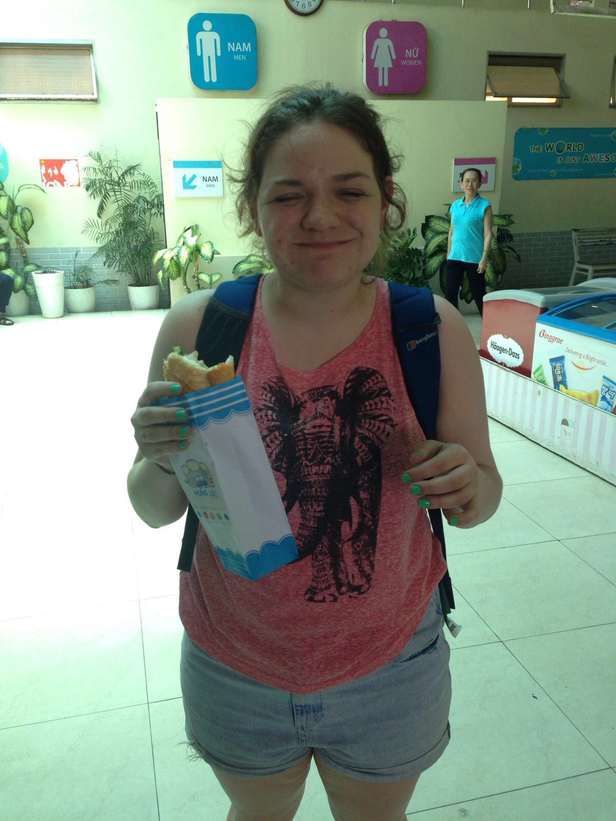 The journey took a full 7 hours so many breaks were had. At the first stop Freya got the most delightful pork roll. We were all highly jealous.